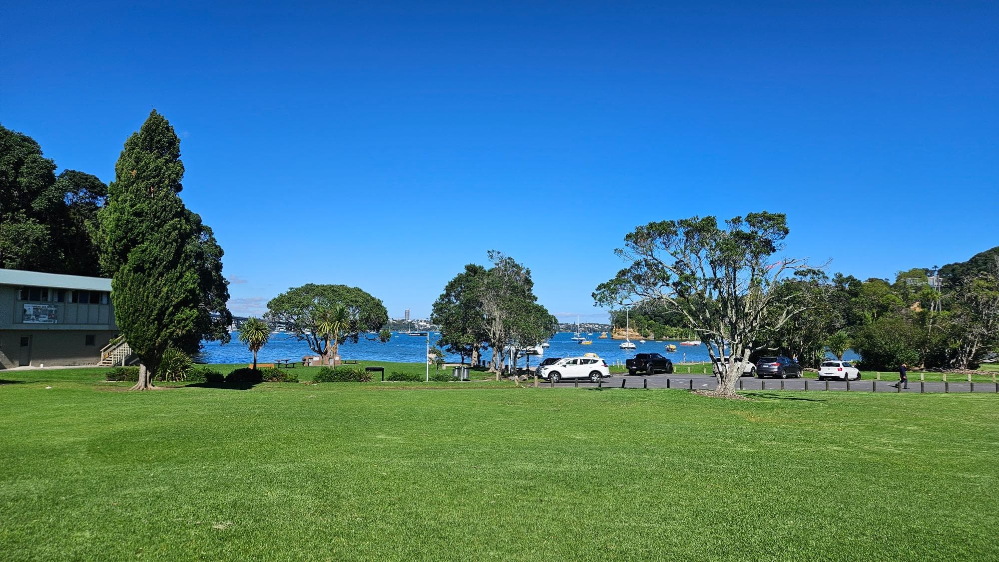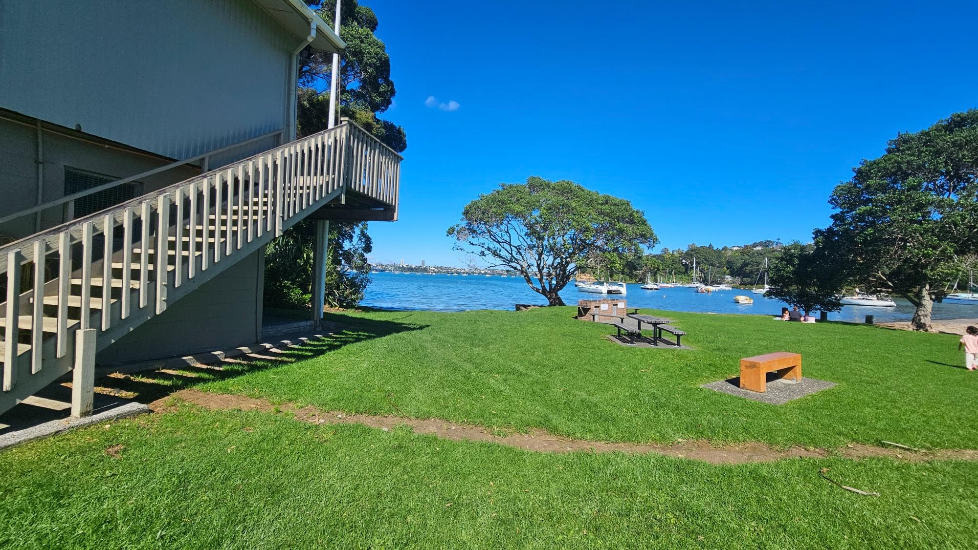 Then there's the view. Right beside the playground, the water opens up and the Auckland CBD skyline sits across the harbour, close enough to feel almost within reach. It's a genuinely beautiful spot, and the kind of backdrop that makes sitting on a bench with a coffee feel like a proper treat. Speaking of which, there are plenty of benches and picnic tables around, so you're never hunting for somewhere to sit.